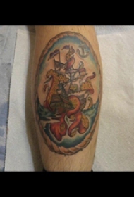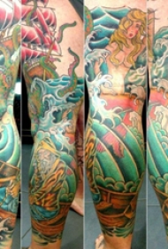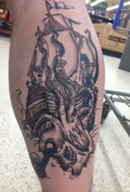 欧美小腿纹身 男生小腿上帆船和章鱼纹身图片