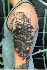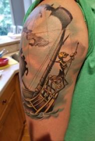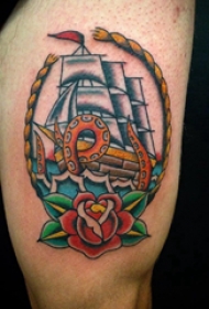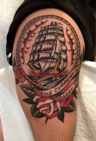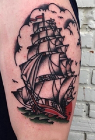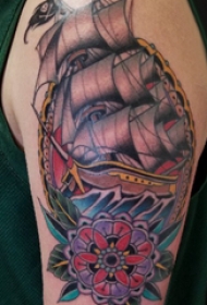 帆船纹身图片 男生大臂上彩色的帆船纹身图片