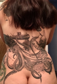 女生后腰纹身 女生后腰上帆船和章鱼纹身图片