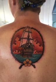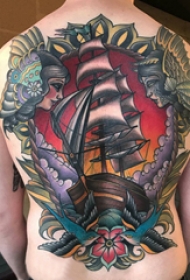 纹身小帆船 男生后背上黑灰的帆船纹身图片