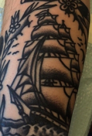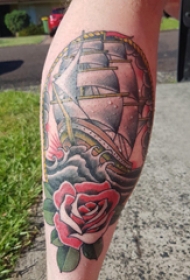 纹身小帆船 男生小腿上帆船和花朵纹身图片