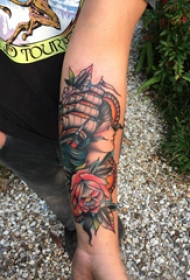 纹身小帆船 女生小臂上彩色的帆船和花朵纹身图片