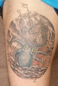 大腿纹身男 男生大腿上帆船和章鱼纹身图片