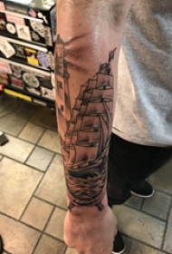 纹身小帆船 男生小臂上黑灰的帆船纹身图片
