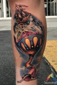 小腿对称纹身 男生小腿上帆船和热气球纹身图片