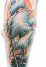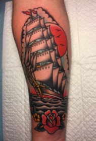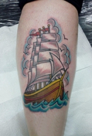 欧美小腿纹身 男生小腿上彩色的帆船纹身图片
