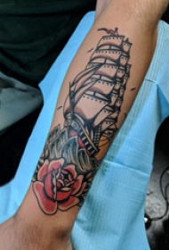 手臂纹身素材 男生手臂上玫瑰和帆船纹身图片