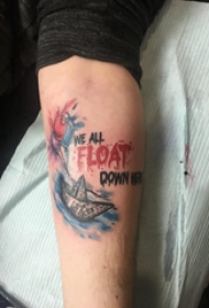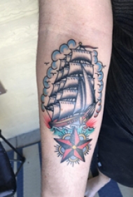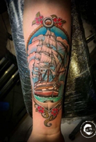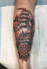 手臂纹身图片 男生手臂上彩色的帆船纹身图片