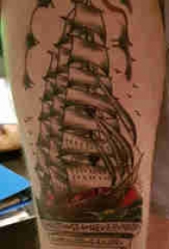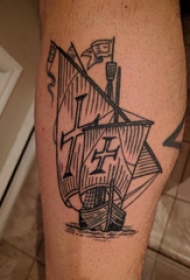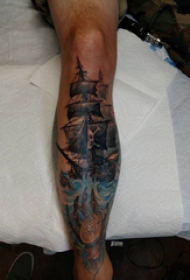 欧美小腿纹身 男生小腿上航行的帆船纹身图片