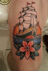 纹身大腿男 男生大腿上彩绘的帆船纹身图片