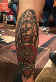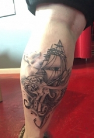 欧美小腿纹身 男生小腿上章鱼和帆船纹身图片