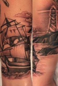手臂纹身图片 男生手臂上帆船和灯塔纹身图片