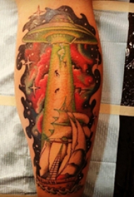欧美小腿纹身 男生小腿上帆船和飞碟纹身图片