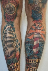 腿部纹身 男生小腿上帆船和灯塔纹身图片