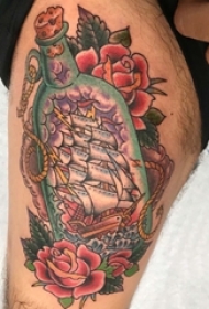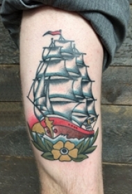 纹身大腿男 男生大腿上彩色的帆船纹身图片