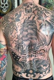 后背纹身线条 男生后背上黑色的帆船纹身图片