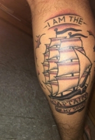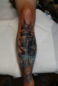 欧美小腿纹身 男生小腿上彩色的海盗船纹身图片