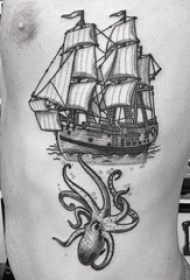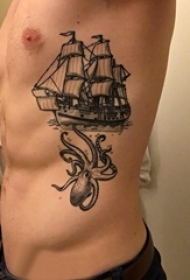 纹身侧腰男 男生侧腰上帆船和章鱼纹身图片