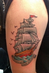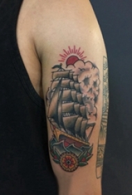大臂纹身图 男生大臂上彩色的帆船纹身图片