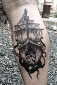 欧美小腿纹身 男生小腿上黑色的帆船纹身图片