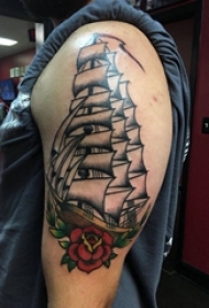 大臂纹身图 男生大臂上花朵和帆船纹身图片