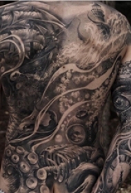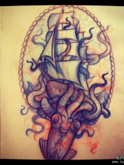 大腿上的黑灰色大章鱼怪和帆船纹身图片