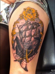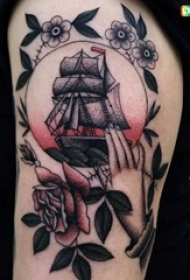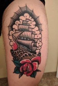 大腿上彩色传统纹身小帆船纹身花朵和蜘蛛网纹身图片