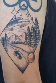 纹身黑色 男生大臂上飞碟和风景纹身图片