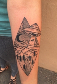 手臂纹身素材 男生手臂上飞碟和风景纹身图片