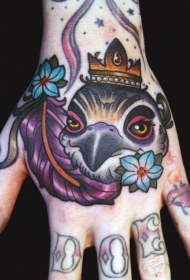手背彩色羽毛小鸟头像和皇冠纹身图案