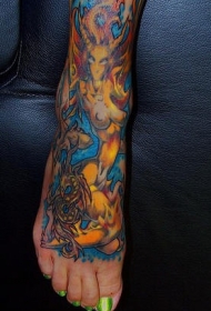 脚背彩色毛骨悚然的怪物男子纹身图案