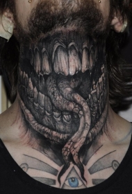 男子颈部彩色恐怖风格怪物吐舌头纹身图案