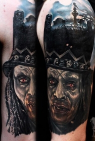令人毛骨悚然的大臂邪恶怪物头与墓地纹身图案