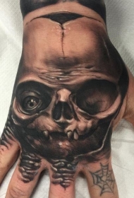 手背黑灰风格怪物头骨与眼睛纹身图案