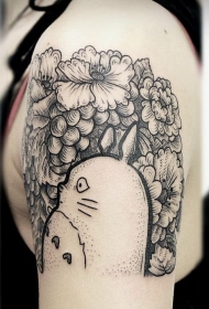 大臂黑白点刺卡通龙猫与花朵纹身图案