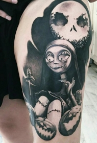 大腿华丽的黑色僵尸新娘与怪物南瓜月亮纹身图案