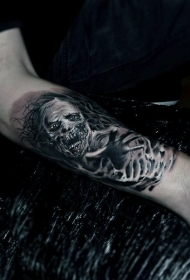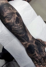 手臂写实的黑白怪物头骨与骷髅纹身图案