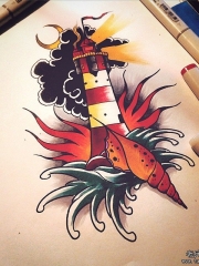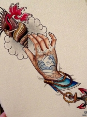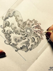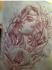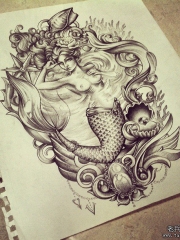 欧美黑灰school美人鱼海螺纹身图案手稿