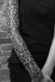 男生手臂上黑色点刺几何线条植物花朵臂环纹身图片