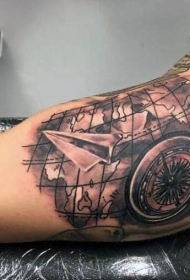大臂航海主题黑灰世界地图和指南针纹身图案