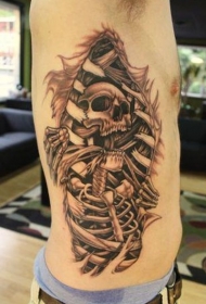 侧肋黑灰风格骨骼骷髅与撕皮纹身图案