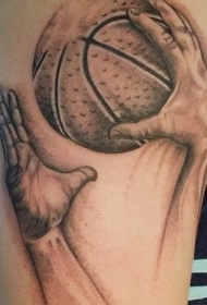 大臂黑灰风格逼真的手与篮球纹身图案