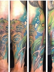 彩色时尚花臂纹身潜水员和鳗鱼和海神三叉戟纹身图片