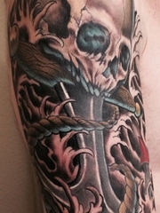 大臂上的邪恶骷髅头和船锚纹身
