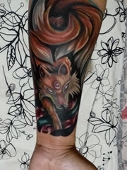 小臂上漂亮的彩色狐狸图案纹身图片