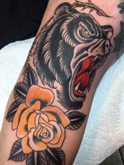 手臂上的传统风格黑熊和黄色玫瑰花纹身