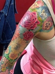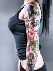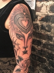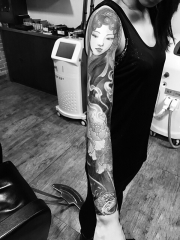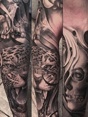 黑灰色花臂上的豹子骷髅头的女性肖像纹身图片