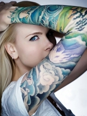 长发女生性感迷人的花臂纹身图案