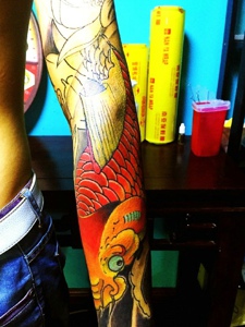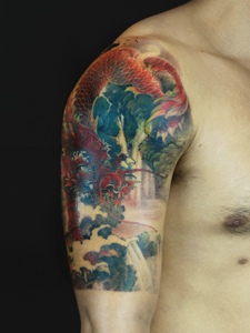 花臂鲜艳无比的大红鲤鱼纹身图案