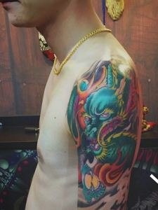 花臂经典老传统火麒麟纹身图案